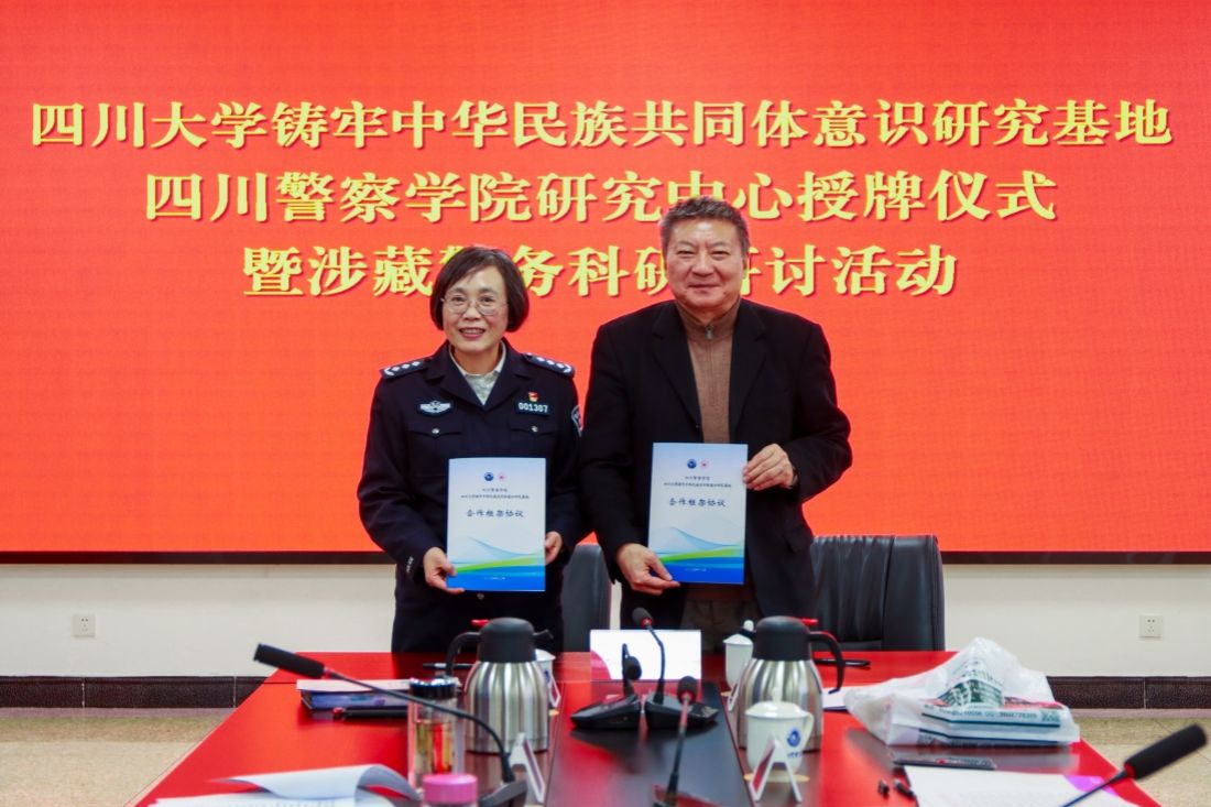 教育部“长江学者”特聘教授、四川大学杰出教授、中国藏学研究所所长、铸牢中华民族共同体意识研究基地主任霍巍,与四川警察学院党委副书记、院长唐雪莲教授分别代表双方签订合作框架协议,并为研究中心揭牌。党委常委、副院长周长明教授,双方有关负责同志参加仪式。